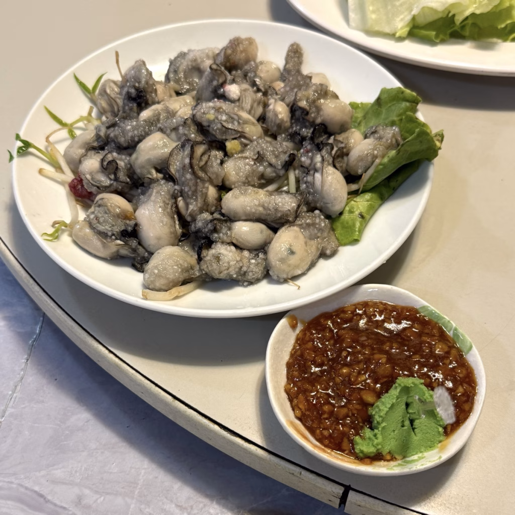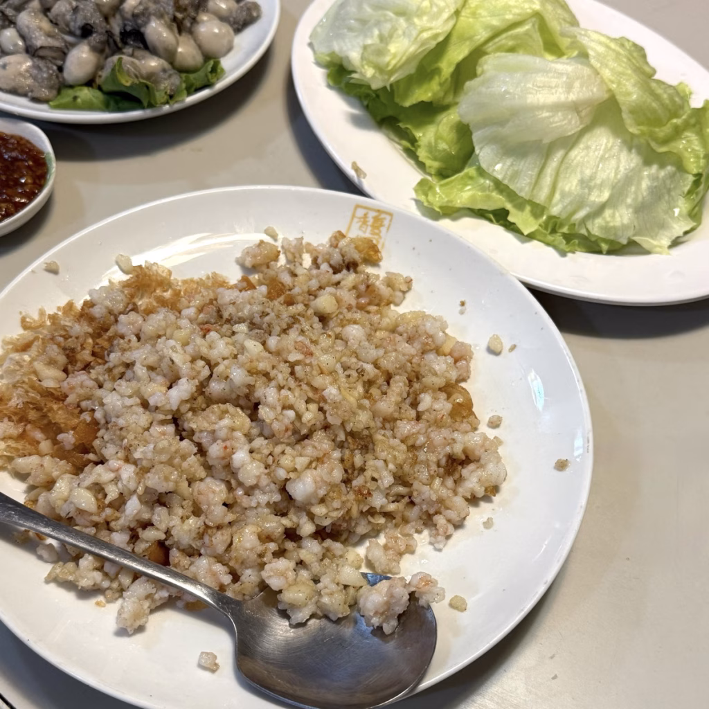但我沒想到端上來的蚵仔可以這麼大顆0.0,裹上粉之後燙得恰到好處,雖然有點腥啦,但沾滿蒜蓉醬的話還是很棒!
