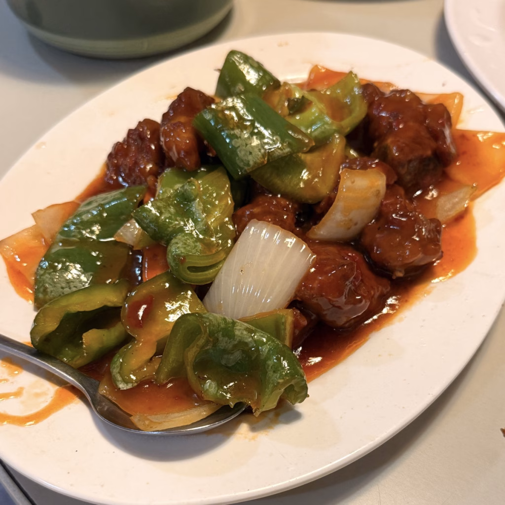 就你想像得到的糖醋排骨的味道,但排骨非常的鮮嫩,我覺得明園老闆的火工真的很厲害,所有菜的熟度都恰到好處。
