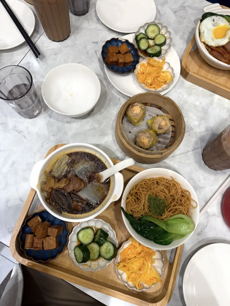 是說我點的是「套餐」除了雞湯之外,還有附三樣小菜,一碗蔥油麵,還有一杯絲襪奶茶。