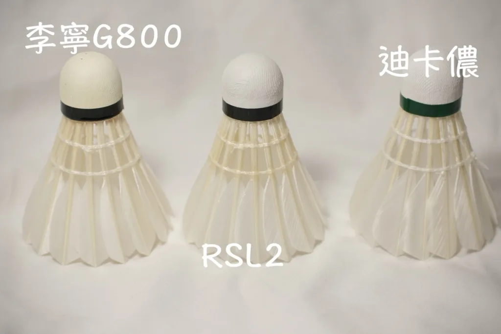 各種價位的羽球的外觀比較(其實這三款都不算便宜),由左到右價位分別是980, 770, 530 (2025.06價格),可以看到比賽級的李寧的G800毛片就是比較粗又飽滿,飛行也比另外兩款穩定且耐用。