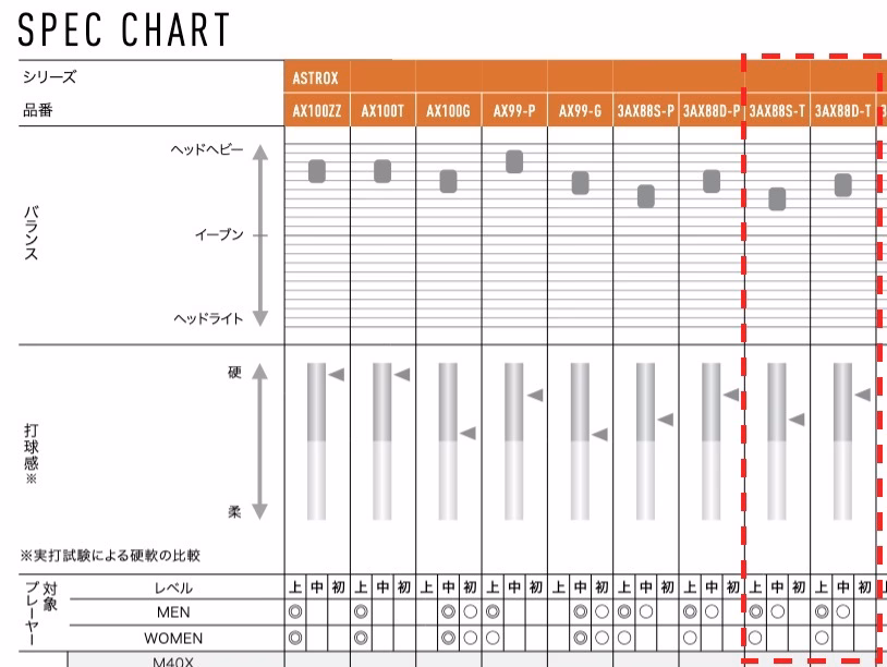 88D和S最主要還是差在中桿硬度和平衡點吧。下表是取自YY的2025年型錄,紅色框框的部分就是88S Tour和88D的比較,可以看到88D的平衡點非常的高,再來88D的打感也偏硬。